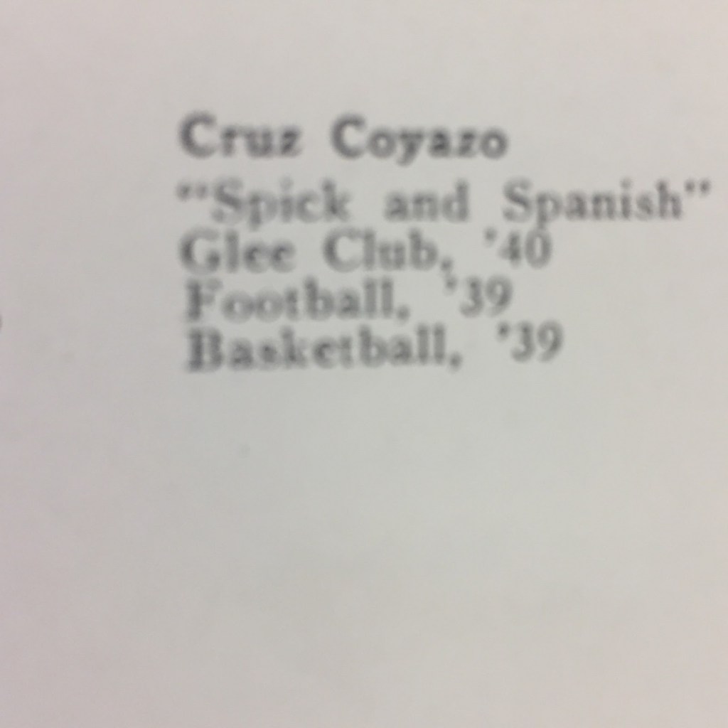 Aranda recuerda cuando su tío abuelo Cruz tenía un insulto racial, «Spick and Spanish«, impreso en su anuario de RHS de 1942.