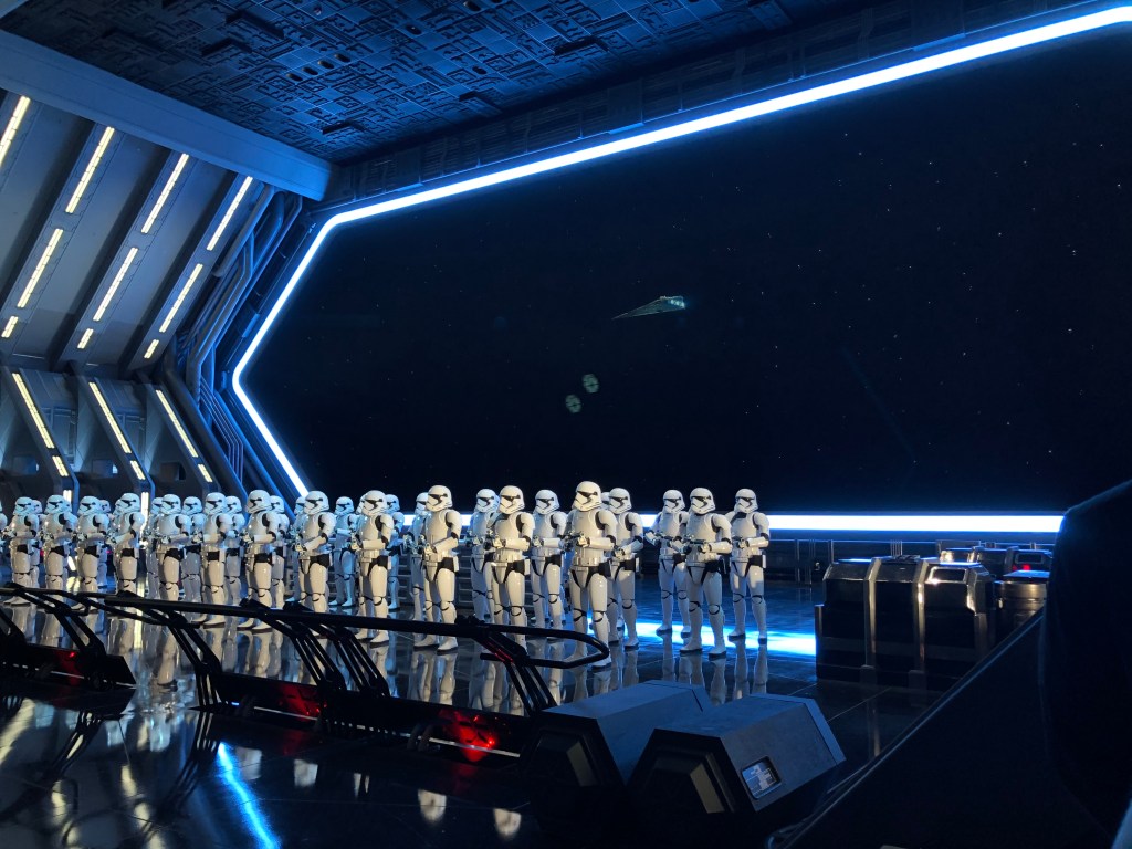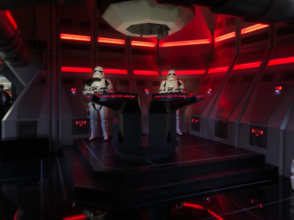 The ride takes you into a First Order Star Destroyer, which has been constructed to scale. You are then directed through the destroyer by cast members who are in character of First Order imperial officers. Upon reaching the loading area, groups are lined up on four different colors. The First Order lieutenants then direct the resistance groups into an interrogation room, where the groups are then rescued by other resistance members. This is where the real ride begins.