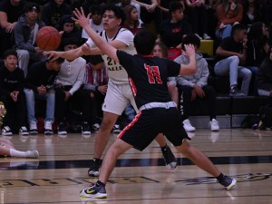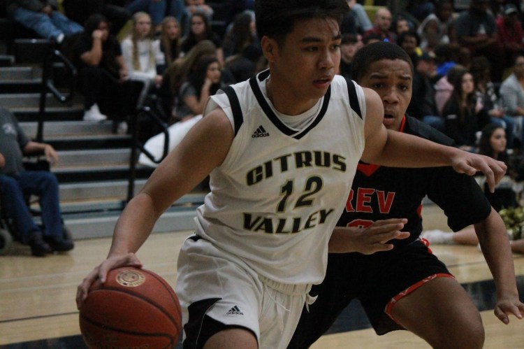 Citrus Valley senior Eddie Marquez attempts to dribble past REV student to the hoop. (GANNON TULLIS/ Citrus Valley Yearbook)