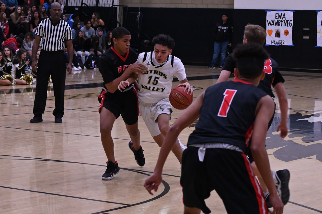 Estudiante del último año Eddie Marquez atempta un regate pasado el estudiante de REV a la canasta. (GANNON TULLIS/ Anuario de Citrus Valley)