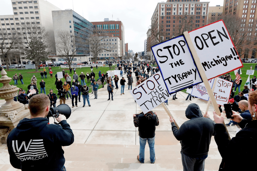 Órdenes de quedarse en casa, diseñado para proteger ciudadanos vulnerables y estabilizar una sistema de salud sobrecargado, están comparados a tiranía en Michigan. (Jeff Kowalsky/Agence France-Presse, por Getty Images)