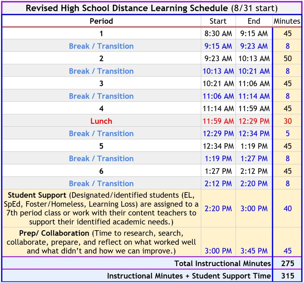 At the moment, RUSD’s distance learning schedule is the same for each weekday: one 50 minute class period and five 45-minute class periods separated by five-minute passing periods and a thirty-minute lunch break. This schedule does not adequately account for the excessive amount of time teachers and students are spending staring at their screens and sitting each day nor permit enough break time to use the restroom or perform any movement to stretch before the next class.