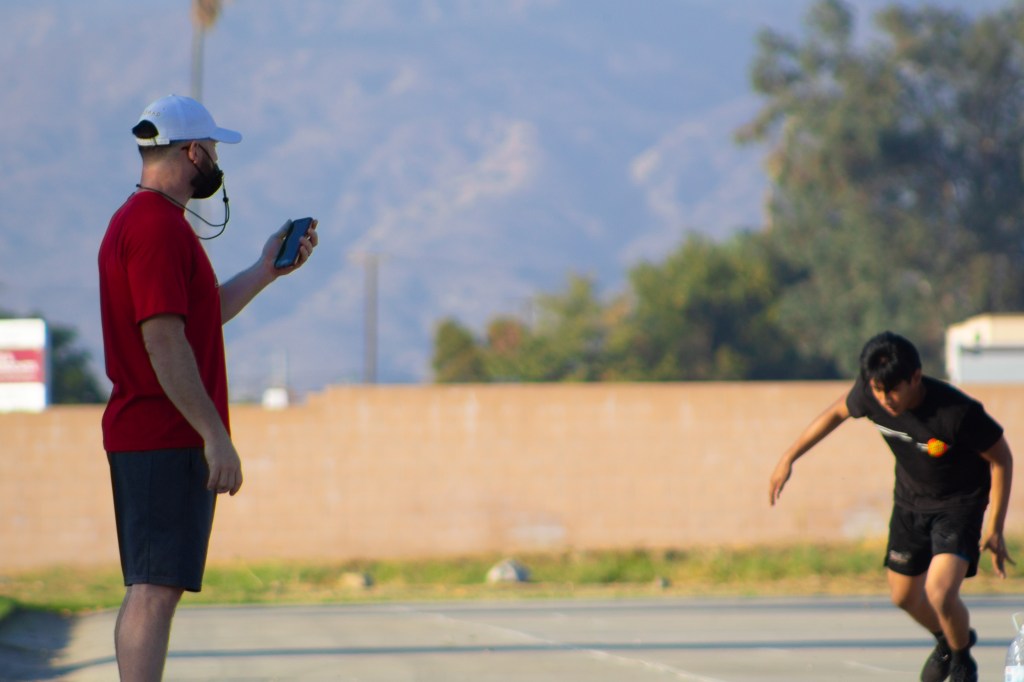 El entrenador de fútbol americano en jefe de Redlands East Valley, Richard Lunsford, mide el tiempo de sus jugadores cuando hacen intervalos de velocidad el 20 de octubre. Los entrenadores usan máscaras todo el tiempo y se les aconseja a los atletas que se las pongan cuando terminan las prácticas. (MIA ARANDA / foto de La Plaza)