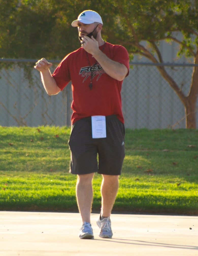 Redlands East Valley head football coach Richard Lunsford times his players as they do sprint intervals on Oct. 20. Coaches wear masks the entire time and athletes are advised to put theirs on when practice ends. (MIA ARANDA/ La Plaza photo)