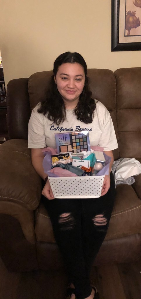 Laura Estrada, estudiante de último año de Redlands High School, con una canasta de regalo el 14 de noviembre. Estrada recibió una paleta de maquillaje, tarjetas de regalo para Starbucks y Taco Bell, algunas gomas para el pelo, mascarillas y esmaltes de uñas de Sergio Vázquez, padre de un estudiante de último año de Citrus Valley. (Cortesía de Laura Estrada)