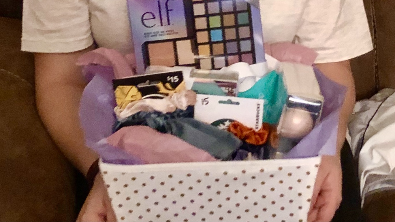Laura Estrada, estudiante de último año de Redlands High School, con una canasta de regalo el 14 de noviembre. Estrada recibió una paleta de maquillaje, tarjetas de regalo para Starbucks y Taco Bell, algunas gomas para el pelo, mascarillas y esmaltes de uñas de Sergio Vázquez, padre de un estudiante de último año de Citrus Valley. (Cortesía de Laura Estrada)