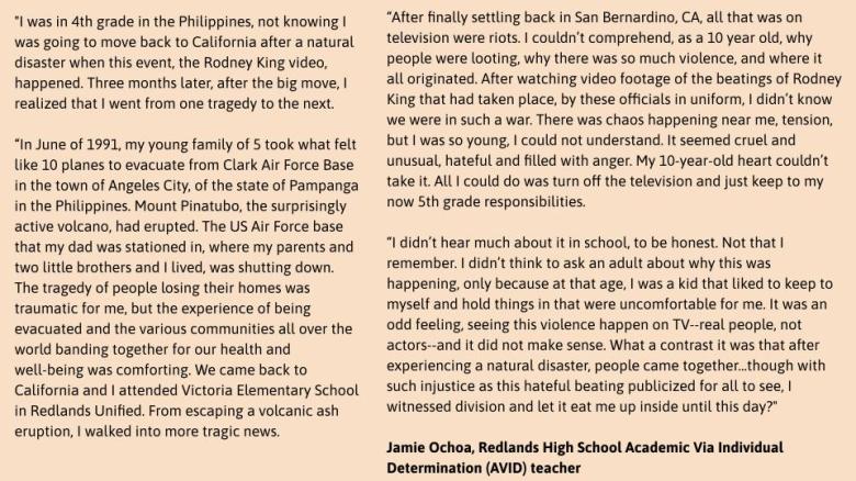 Redlands High School teacher Jamie Ochoa had moved back to California from the Philippines in 1991 to discover the well-known video of Rodney King that was being displayed on various news channels. As an 11-year-old, she couldn’t quite understand the severity of the event.