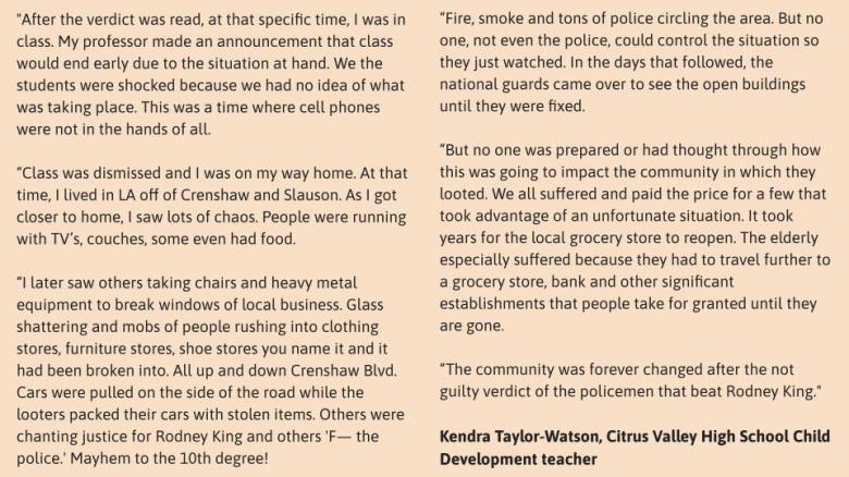Citrus Valley High School teacher Kendra Taylor-Watson was living in Crenshaw in South LA when the riots transpired.