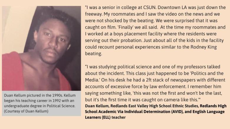 Redlands East Valley teacher Duan Kellum was a senior at California State University, Northridge in Los Angeles in 1991 when he witnessed the Rodney King video on the news.