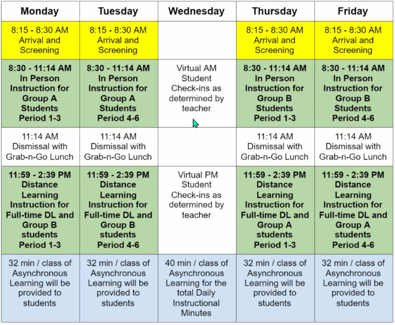 Aunque existe un plan para el nuevo horario para que los estudiantes vuelvan a sus asientos en clase, la cuestión de cómo se dividirán a los estudiantes en grupos aún no está determinada. Hay un plan para un grupo A y un grupo B para clases tanto en línea como presenciales, pero la organización de estos estudiantes aún no está determinada y se discutirá en la próxima reunión de la junta. Para los estudiantes que eligen regresar a la instrucción en persona, deben esperar un nuevo sistema que incluya seguir el protocolo adecuado de aprendizaje a distancia, el uso de máscaras de salud y exámenes de salud. Las escuelas administrarán más detalles con respecto al Plan de seguridad que describe el esquema general de la reapertura del plan escolar.