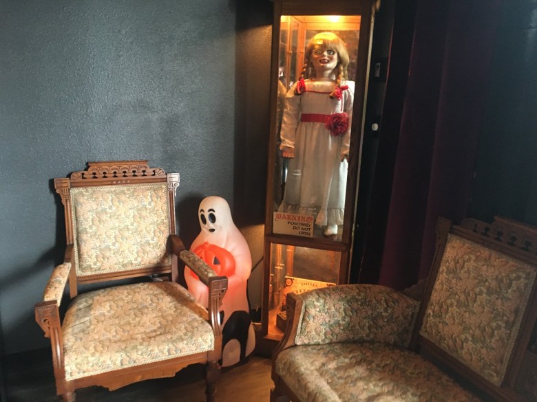 Una réplica exacta de la muñeca Anabelle de la franquicia «The Conjuring» se encuentra dentro de su caja de vidrio en la esquina de descanso de la tienda junto con una tabla ouija, una estatua fantasma amigable y dos muebles de estilo de los 80. (DESTINY RAMOS MARIN/ foto de La Plaza)