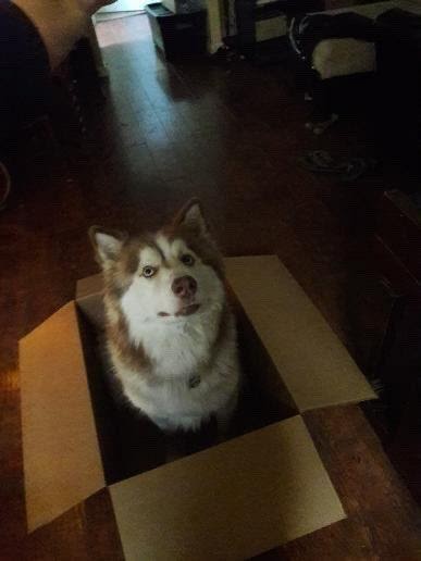 Tyler Ardnt, un estudiante de tercer año en Redlands East Valley High School, muestra a su perro Grizzly, un husky-malamute de dos años, sentado cómodamente en una caja de cartón. (Cortesía de Tyler Ardnt)