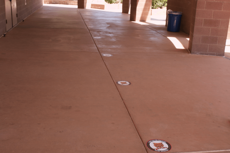 Stickers were placed on the floor in front of the textbook office to remind students of the social distancing regulations which require them to maintain 6-feet distance when outside. (ALISSON BERMUDEZ/ La Plaza photo)