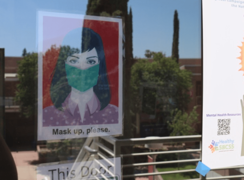 A sign posted on the library door politely reminds students to wear a mask. Due to current Covid-19 guidelines, students and faculty must wear a mask in order to attend school. (ISAAC MEJIA/ La Plaza photo)