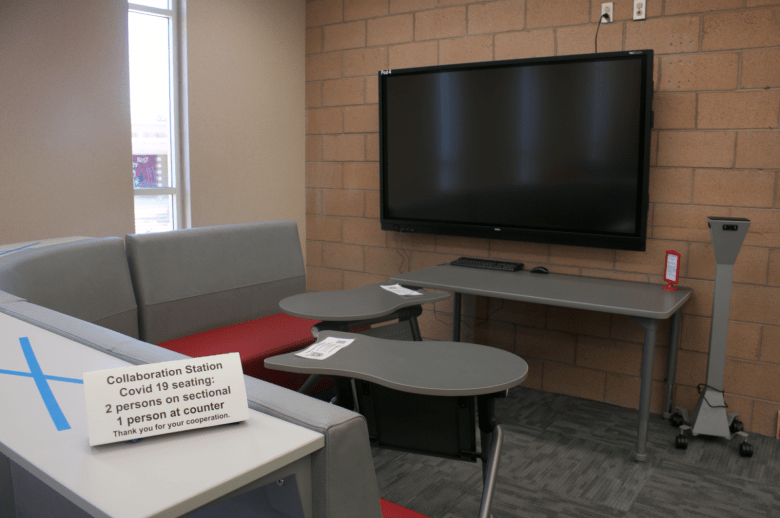 The library contains new collaboration stations each equipped with a lounge couch and a monitor. Currently, stations can only accommodate three students and are not allowed to be used to their full capacity. (ISAAC MEJIA/ La Plaza photo)