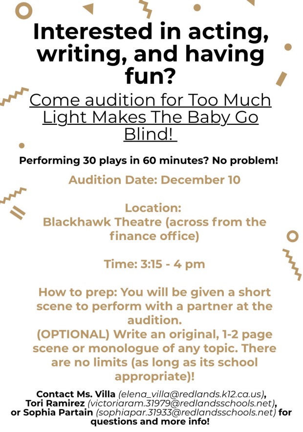 Actuación, escritura y habilidades técnicas son aspectos que se buscan durante las audiciones para “Too Much Light Makes the Baby Go Blind”. Las audiciones para la producción son el 10 de diciembre a las 3:15 p. m. en el Teatro Blackhawk. Los estudiantes tienen la capacidad de convertirse en escritores o trabajar entre bastidores en tecnología para el programa; sin embargo, todavía están obligados a asistir a la audición. En la audición, deben aclarar que están interesados en escribir o trabajar entre bastidores en tecnología. Los estudiantes pueden participar en múltiples áreas si así lo desean.