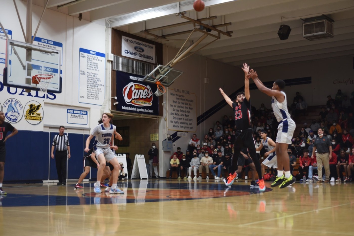 Arriba: Ashir Shaw, estudiante de tercer año de Redlands East Valley High School, intenta bloquear un triple del estudiante de último año de Redlands High School, Elijah Hester. RHS logró obtener múltiples triples alrededor de la línea de tres puntos, lo que les ayudó a obtener una ventaja durante el juego. (AILEEN JANEE CORPUS/ Foto de Ethic News)