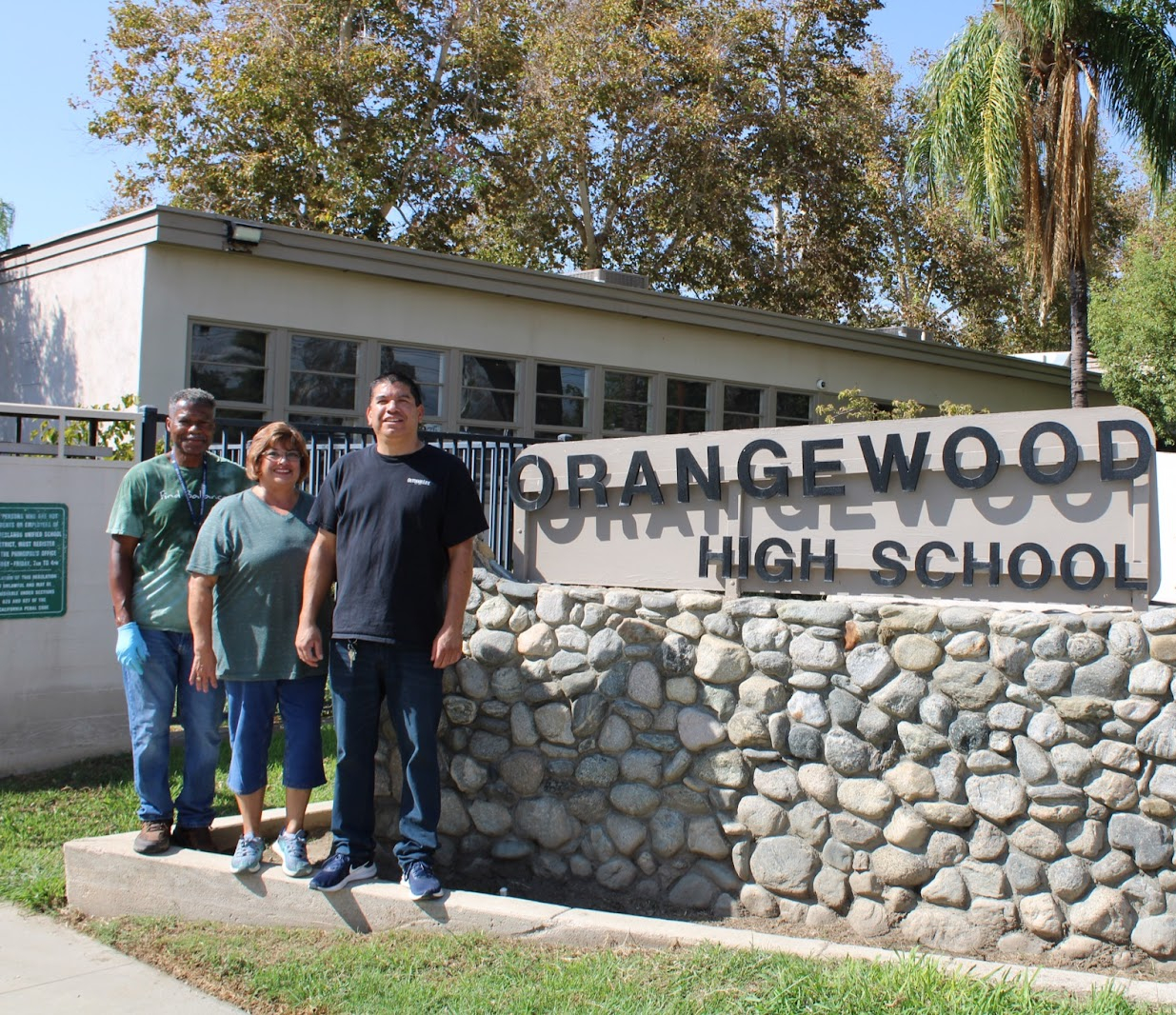 El conserje de Orangewood High School, Mynel Shelton, la trabajadora de nutrición Cynthia Duran y el conserje Alfred Cabral se paran en la entrada de Orangewood en Texas St. en Redlands. (Foto de Matthew Mendes/Ethic News)