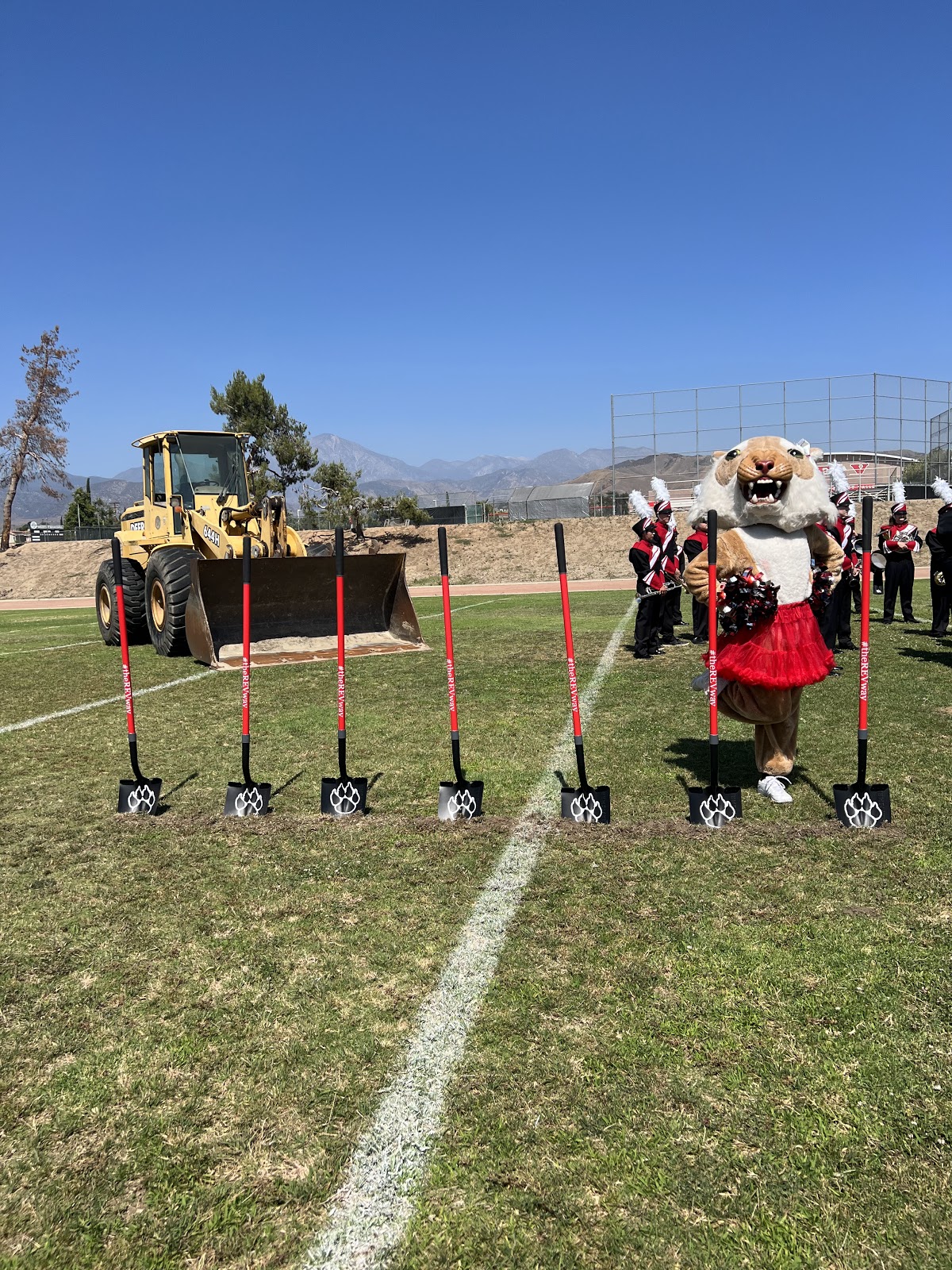 La mascota de Redlands East Valley High School, Wendy the Wildcat, se encuentra junto a las palas que simbolizan la apertura del terreno para el nuevo estadio el 6 de junio de 2022. (Craig Morrison / Ethic News Photo)